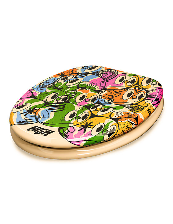 The Color Bomb toilet seat, the second exclusive model designed by artist Bishop Parigo for TohaaDesign, stands out with its bold burst of color, featuring a soft pastel background and energetic, eye-catching birds. The contrast between gentle tones and vibrant accents creates a strong, instantly recognizable graphic design. An original WC seat that brings an artistic and unexpected touch to the bathroom space.